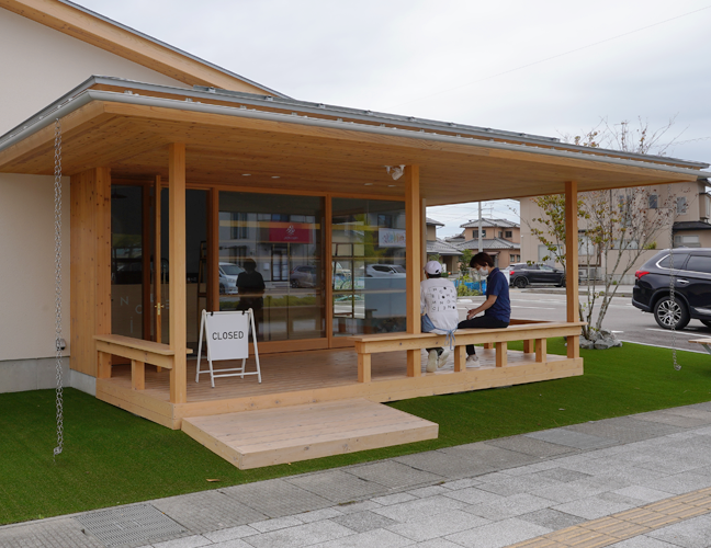 ▲雨除けと腰掛けにもなる大きな屋根のウッドデッキには、お客様を大切にしたいという想いが込められています