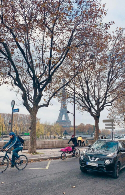 セーヌ河沿いの通りからのエッフェル塔の眺め