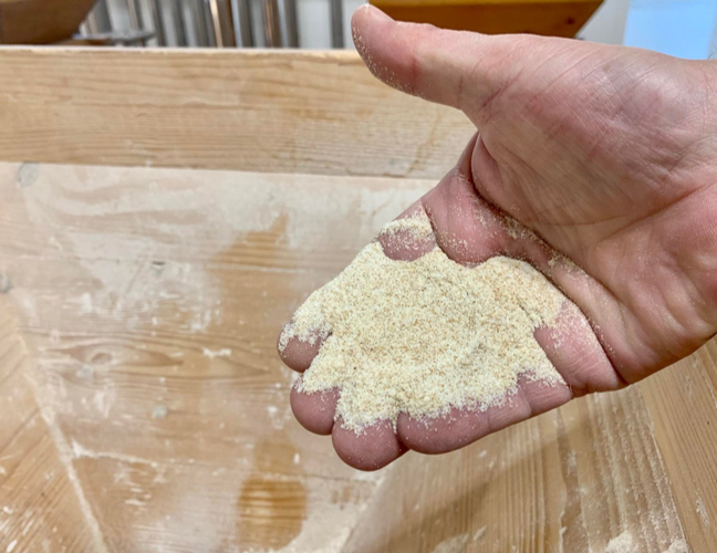 製造途中の小麦をさわると、まだふすまが残っている状態でした