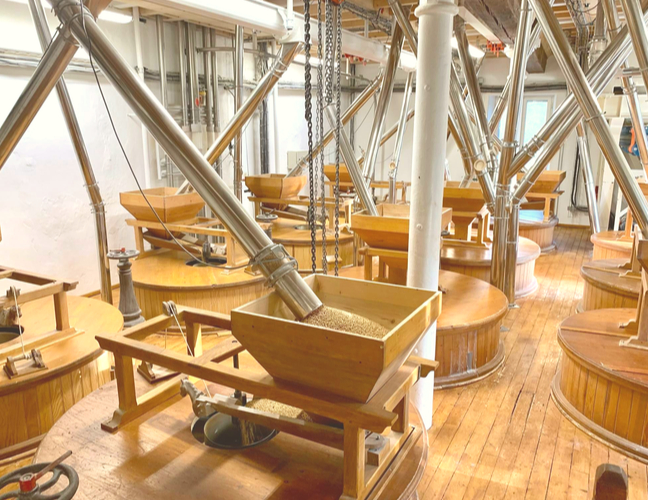 目の前では、工場内に張り巡らされたパイプから、石臼に投入する前の小麦がどんどん流れていきます。