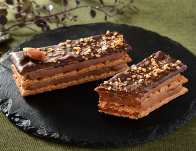 256層のパイ生地。サクサクパイで心弾む。ヘーゼルナッツとアーモンド入りのペーストを使用した生チョコクリームに香ばしく焼き上げたサックリ食感のパイを重ねました。上層には、チョコレートをコーティングし、アーモンドをトッピングしました。チョコとサクサク食感が楽しめます。