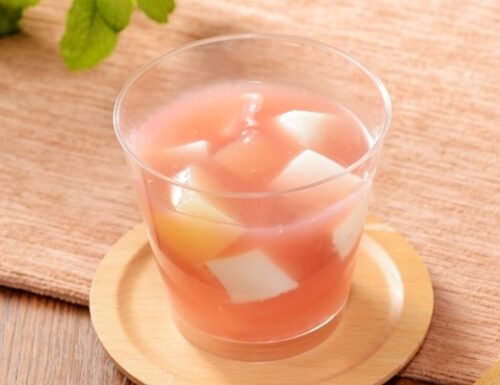 初夏にぴったりの桃の瑞々しい味わいが楽しめるスイーツ!桃のとろ~りジュレで、桃のダイスとわらび餅、ミルクゼリーをとじこめています。優しい桃の香りが口の中に広がる見た目も華やかなスイーツに仕立てています。