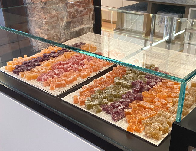 何が絶品かと言うと、そのフレッシュさです。噛んだ瞬間、使われているフレーバーがジュースのように口の中に広がります。このフレッシュさを出すのにどれだけ苦労されたんだろう。シンプルが故にその手仕事のすごさを感じます。オレンジやカシス、フランボワーズといった、日本でも定番のフレーバーから、ルバーブなどの珍しいフレーバーも楽しむことができます。