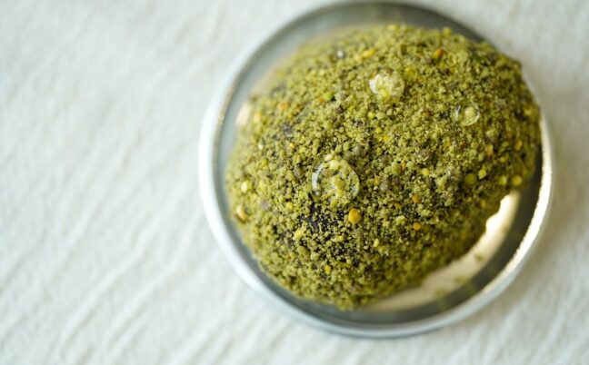 水滴が今にも滴りそうな「禅」(ZEN)はシェフのスペシャリテで人気の商品なんだとか。ピスタチオのブリュレ、玄米茶のムースやソース、まわりにはクラッシュした抹茶クッキーとピスタチオをまとっている。
