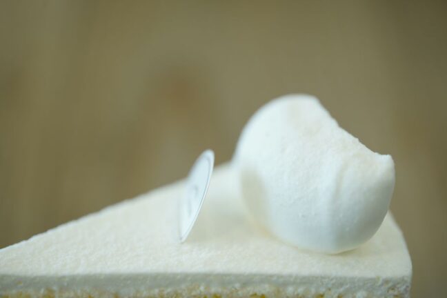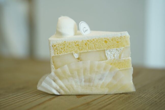 通常はショートケーキといえば、上にフルーツがのっているが、この「ronen」のショートケーキは真っ白。色合いは淡く、まるで雪化粧をしたかのようなフォルム。