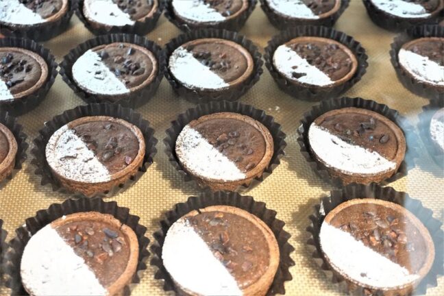 サクサクのビスケット生地に、しっとりとして口溶けなめらかなガトーショコラが合わさっています。トッピングのカカオニブはカリッとした食感がアクセント。ほろ苦いカカオの味わいが楽しめます。