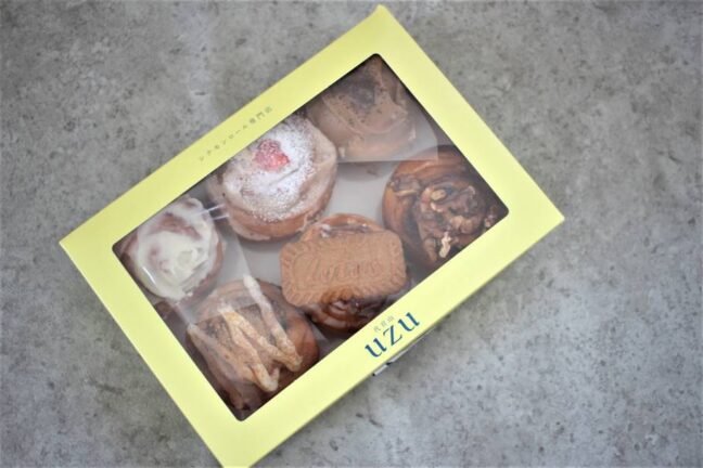 uzuカラーの黄色い箱から覗くシナモンロールたちがなんともかわいらしいです。
