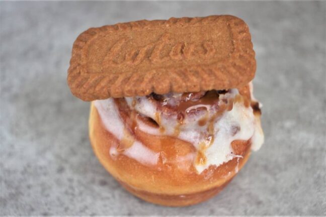 Lotusビスケットがドーンと1枚のっているだけでなく、じつは中にも砕いてロールしているんだとか。
