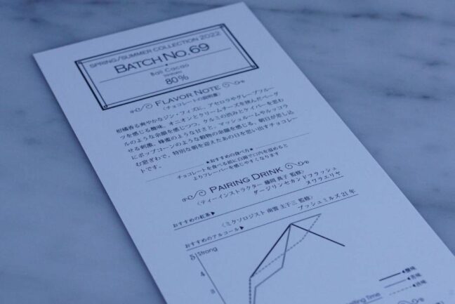 また、今シーズンはインドネシア バリ島産のカカオ豆を使用したチョコレートに統一され、それぞれ65、70、75、80%のチョコレートが発売されている。まずは、その中でも一番パーセンテージの高い「Batch no.69」を。