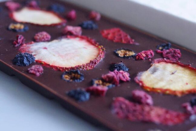 ビタースイートなダークチョコレートの上で展開される甘酸っぱいベリーの掛け合い。低温乾燥されたフルーツは酸味が凝縮されており、フレッシュ感もありながら濃厚で華やかな果実の香りも楽しめる。プロファイリングカードに書かれたペアリング、ニルギリやアッサム等の紅茶や、ポートワインとの相性もきっと良いはず。