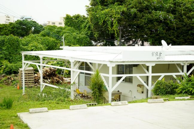 沖縄県宜野湾市。お店は那覇市からは約30分強ほどの外国人住宅街にあります。バス停から歩いていくと、汗も流れ出るような傾斜のある坂。そんな坂の上を登り切ったところに、白い平屋の建物「宗像堂」が。OPENからすぐに、パンを求めるお客さんで、既に列ができていました。