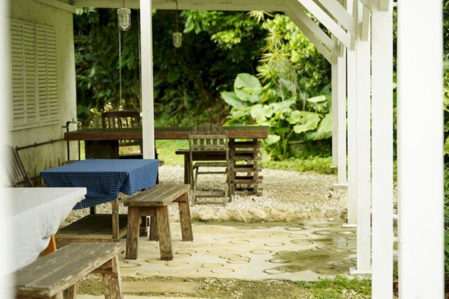 外にはイートインできるスペースも。外国人住宅を改装したお店で、風通しがよい場所にあり木々も生い茂って、とても心地よい風が吹きます。パンを食べるのにも最高の環境です。