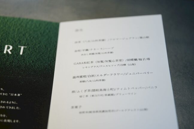 お待ちかねのコース料理の紹介です。「VERT」のデザートコースは豊富な茶葉のラインナップを楽しめる「日本茶」と、デザートの5品・5杯のペアリングコースになっています。それぞれデザートに合わせたお茶は、産地や品種も異なり、温かいお茶から水出しにしたものなど、様々な表現を持って、そのお茶の持つ魅力を田中シェフが引き出してくれます。メニューにも、当日のお茶の種類や農家さんの情報が。
